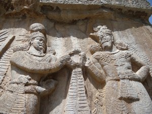 Bas relief image from: https://commons.wikimedia.org/wiki/File:Bas-Relief_of_Shah_Ardashir_II_Receiving_Crown_of_Blessing_from_Ahura_Mazda_%28or_Shapur_II%29_-_Taq-e_Bostan_-_Kermanshah_-_Western_Iran_%287422022602%29.jpg