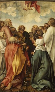 After Jesus ascends into heaven and out of sight, the eleven and their companions are asked by two men dressed in white garments who are standing beside them, “Why are you standing there looking at the sky?”