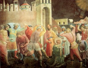 Andre de Giusto (Manzini): Stoning of Saint StephenIt is difficult to connect the idea with God as a Good Shepherd to accounts like today’s Noontime. In this famous scene of Stephen’s martyring, we have much to observe, much to absorb. On this Sunday when we celebrate good shepherding, let us pause to examine the story and ourselves; and let us reflect.